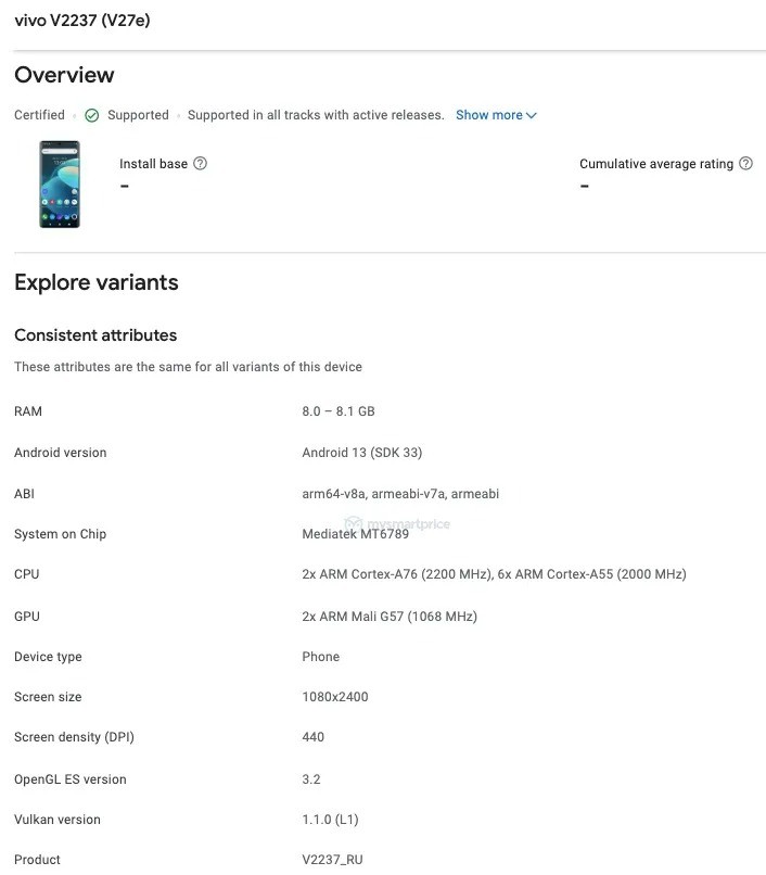 O Google Play Console revelou que o aparelho tem numeração V2230, virá com display de (1.080 x 2.400 pixels) e densidade de pixels de 440 ppi. O processador MediaTek MT6896Z é composto por quatro núcleos Cortex A78 e quatro Cortex A55.