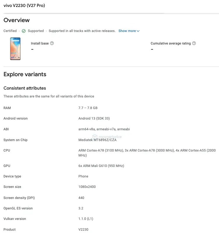 O banco de dados do Google Play Console indica que um aparelho sob numeração V2230 — possivelmente o vivo V27 Pro — será equipado com o Dimensity 8200 da MediaTek e ostentará uma tela com resolução Full HD+ (1.080 x 2.400 pixels). O vivo V27, por sua vez, pode ser uma versão renomeada do vivo S16, equipado com Snapdragon 870.