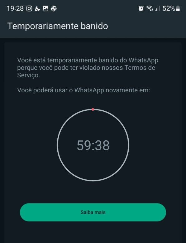 Conforme relatos apurados pela equipe do TudoCelular, o banimento é de 1h e os usuários suspensos temporariamente são informados que a medida foi tomada após uma violação dos termos de serviço do mensageiro da Meta.